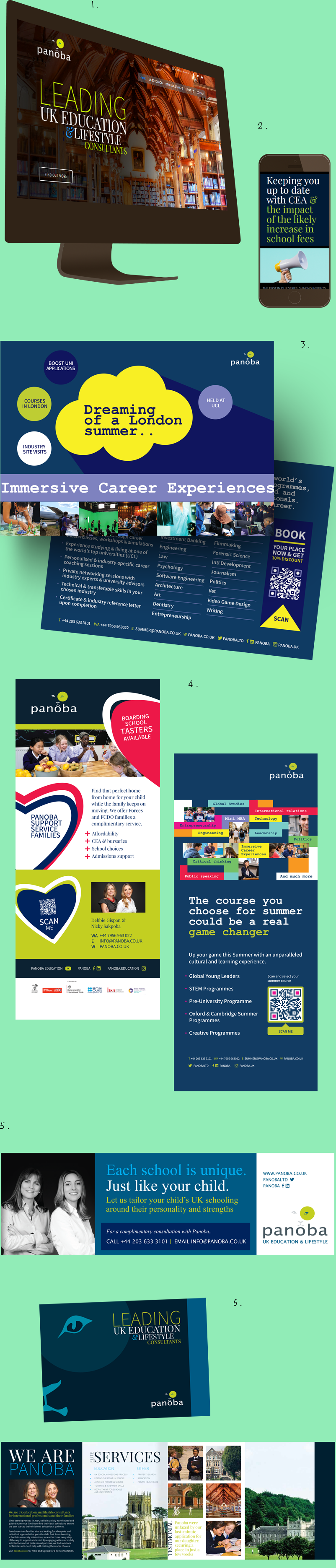 Panoba are UK education consultants for international and military families. We design, produce and manage Panobas’ print and digital content, inclusive of their website (1) and e-shots (2) on the digital side and brochures (6), postcards (3), magazine adverts (5) and exhibition banners (4) on the print side. To head it all up, a video we produced in Canva for them earlier this year.